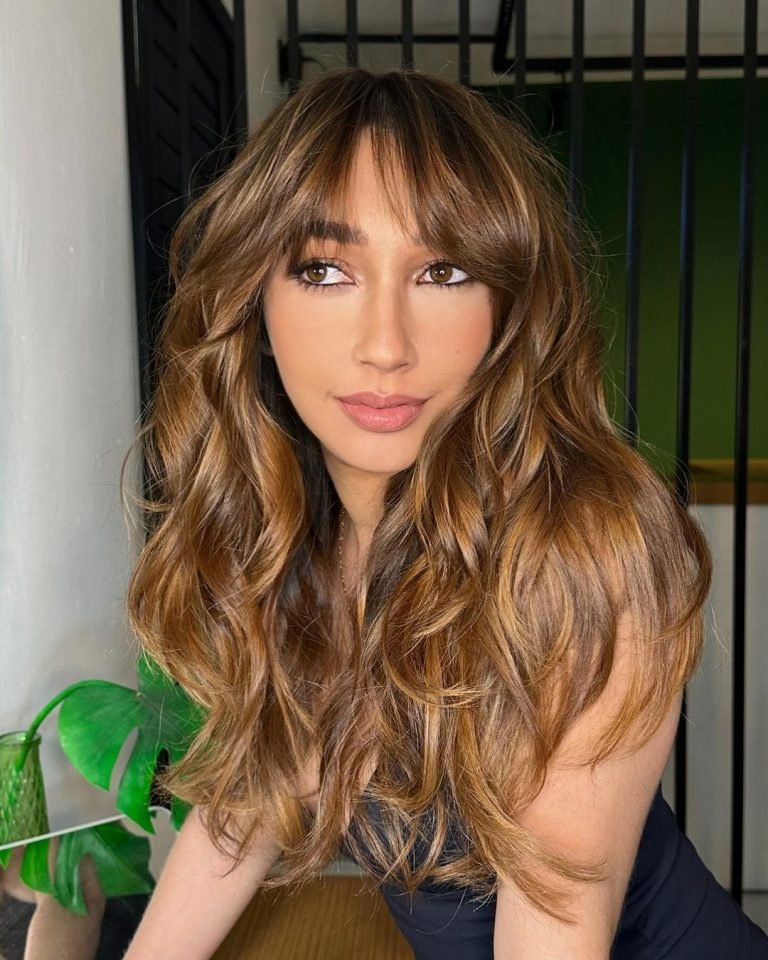 The honey-toned waves here add a sun-kissed glow to an already gorgeous curtain fringe. The bangs drape effortlessly, giving that dreamy, undone texture that feels almost Parisian.