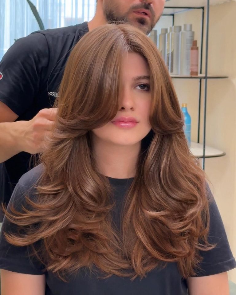 Here, the classic curtain bang gets an extra dose of movement thanks to those feathered, bouncy layers. There’s this soft swirl at the ends that brings the whole style to life, almost like a built-in wind machine moment.