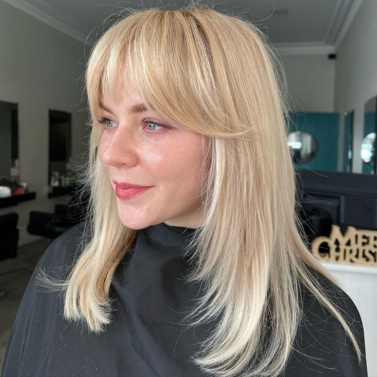 This blonde curtain fringe is all about softness — gentle layers, feather-light movement, and a creamy tone that glows from every angle. The bangs skim the brows in the most flattering way and transition seamlessly into the mid-length layers.