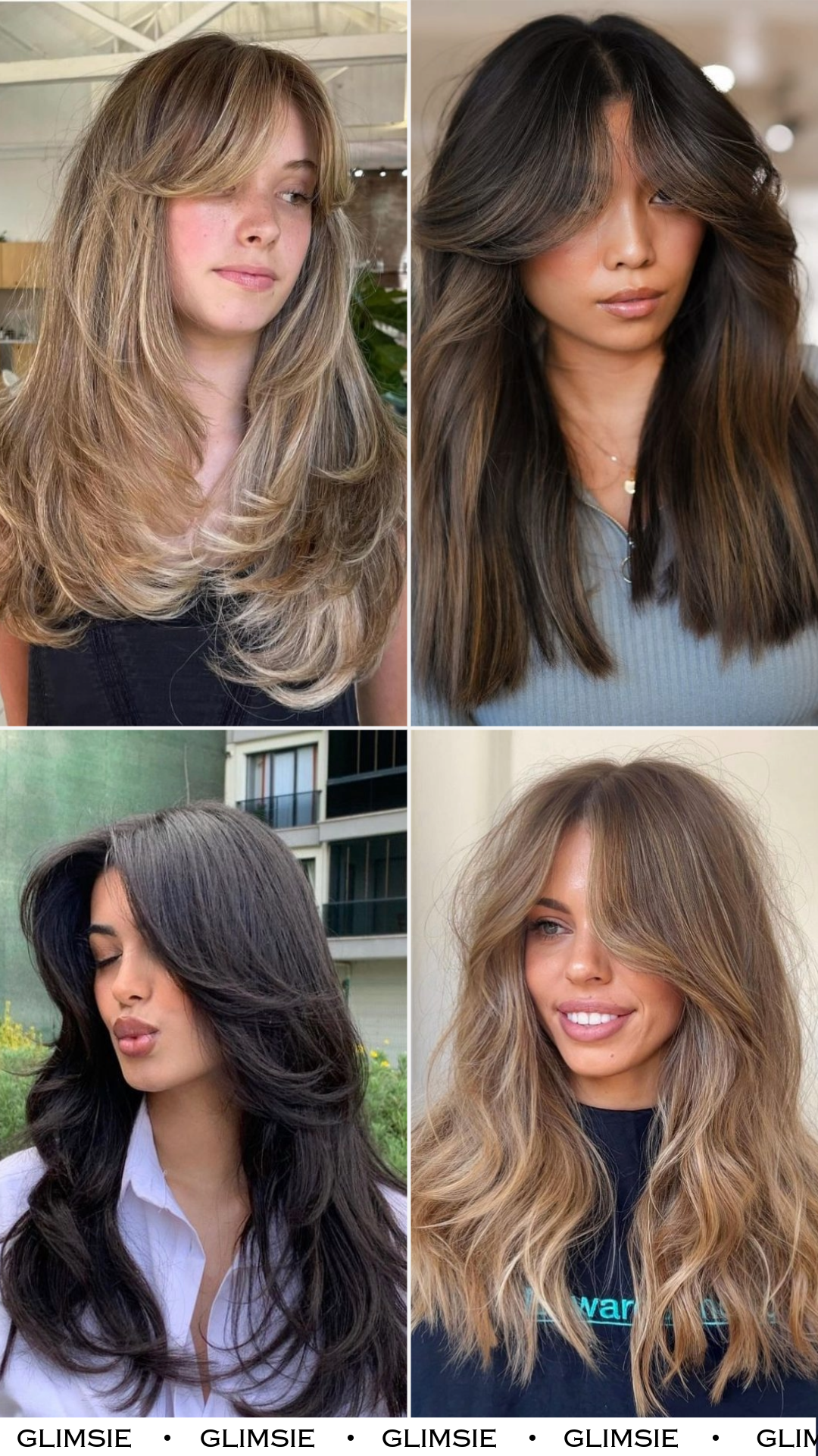Think of this one as the “cool girl classic.” Long, flowing layers glide into a perfectly parted curtain bang, creating a shape that’s balanced, flattering, and endlessly wearable.
