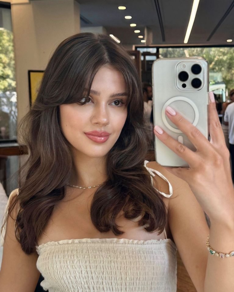 And the bangs? They create the perfect frame, brushing the cheekbones just enough to feel flirty without trying too hard. It’s the kind of cut that makes every casual moment feel just a little cinematic.