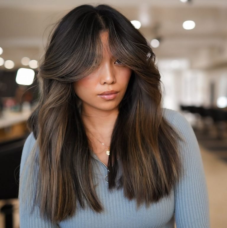 There’s something so charming about these soft cocoa layers paired with a breezy curtain fringe. The bangs fall just lightly over the brows, giving that sweet, modern-retro balance that instantly softens the whole face.
