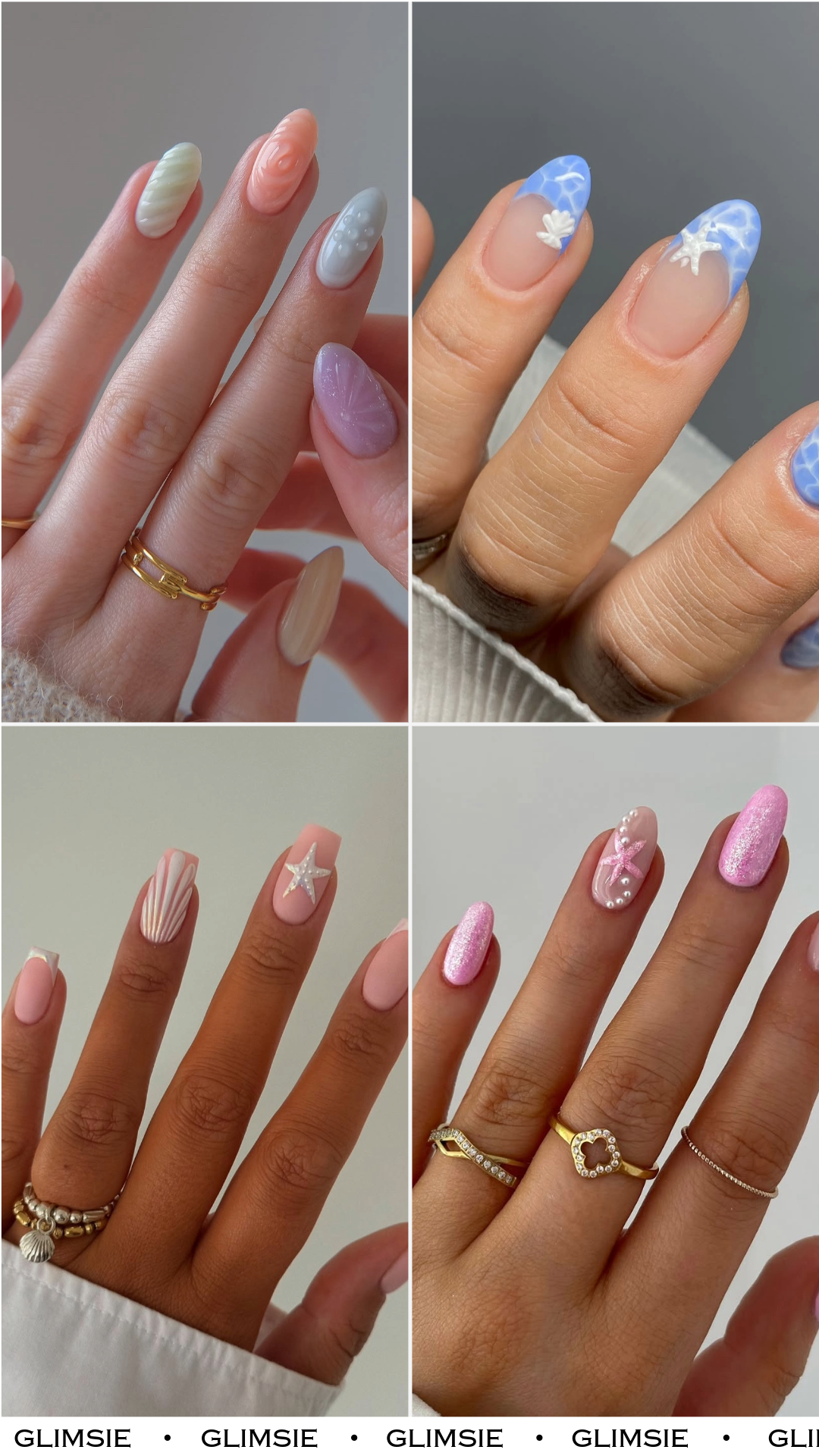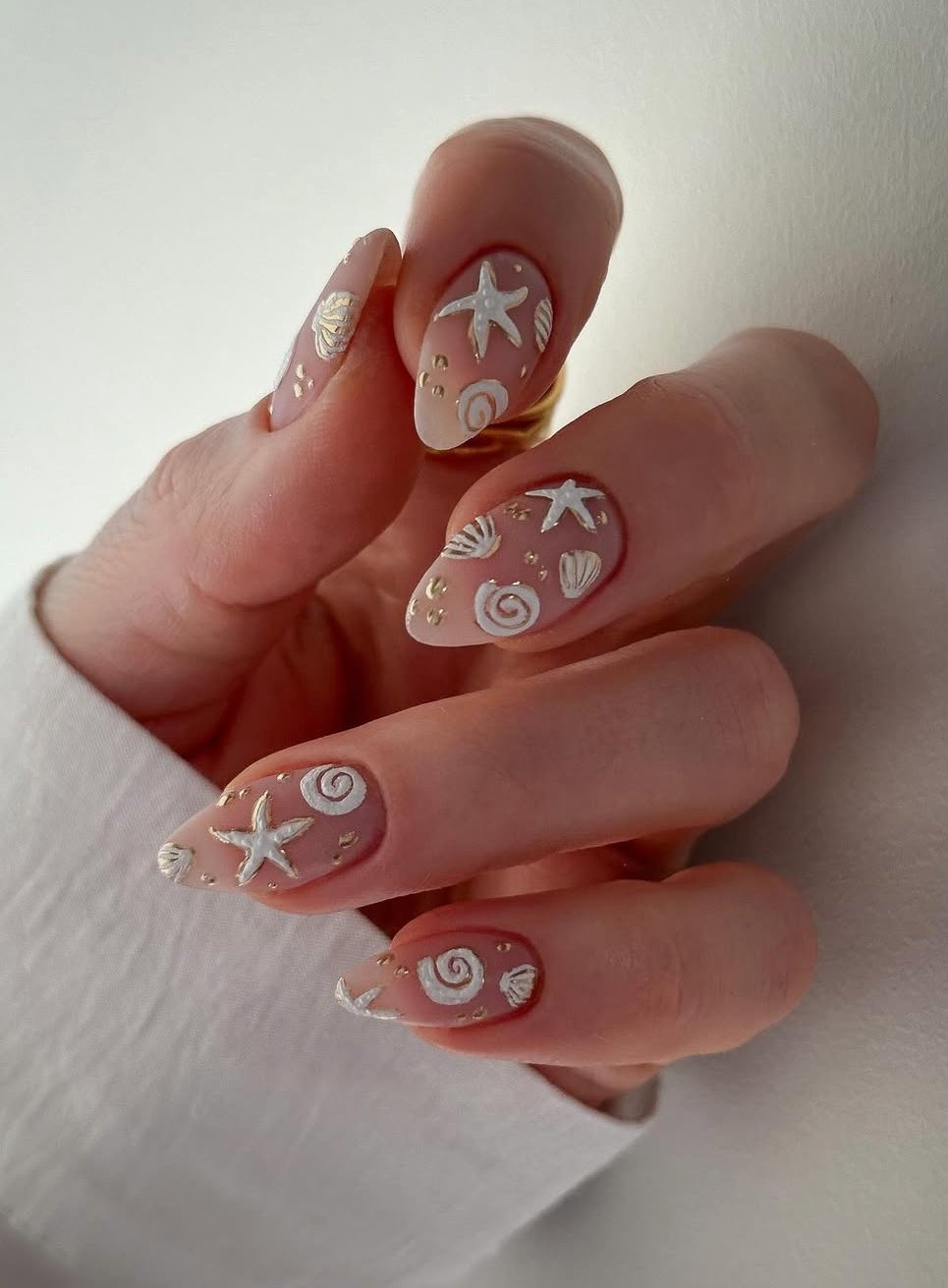 This set leans into soft coastal elegance with creamy nude tones and delicate white shell designs. The tiny starfish and subtle swirl details give the nails that seaside charm without overwhelming the look.