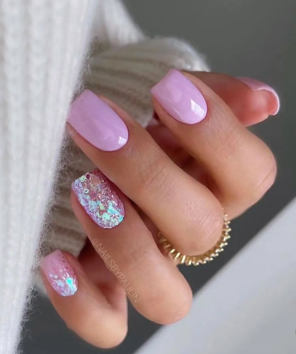 This set mixes soft lavender polish with a playful burst of glitter texture. Most nails stay smooth and glossy, while the accent nail brings in chunky iridescent sparkles that shimmer with every movement.