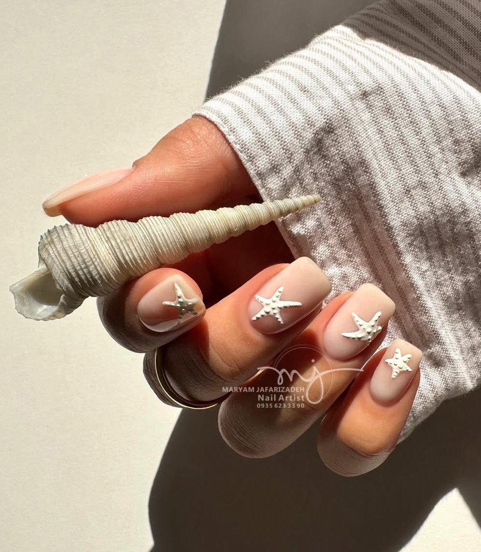 This manicure proves that beach nails don’t always need bright colors to stand out. The soft pink base keeps things clean and minimal, while the sculpted shell design and silver starfish add that coastal detail.