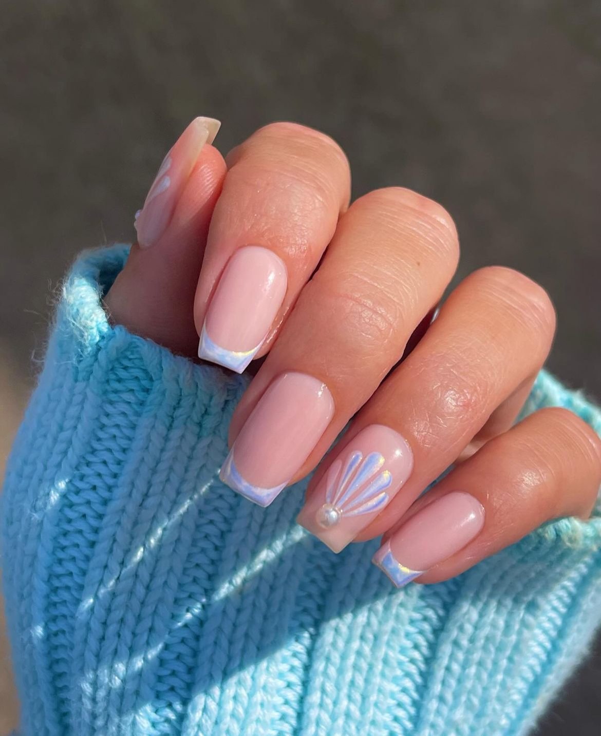 There’s something really calm and clean about this manicure. The glossy nude base paired with those soft iridescent French tips gives it that “effortlessly pretty” kind of vibe.