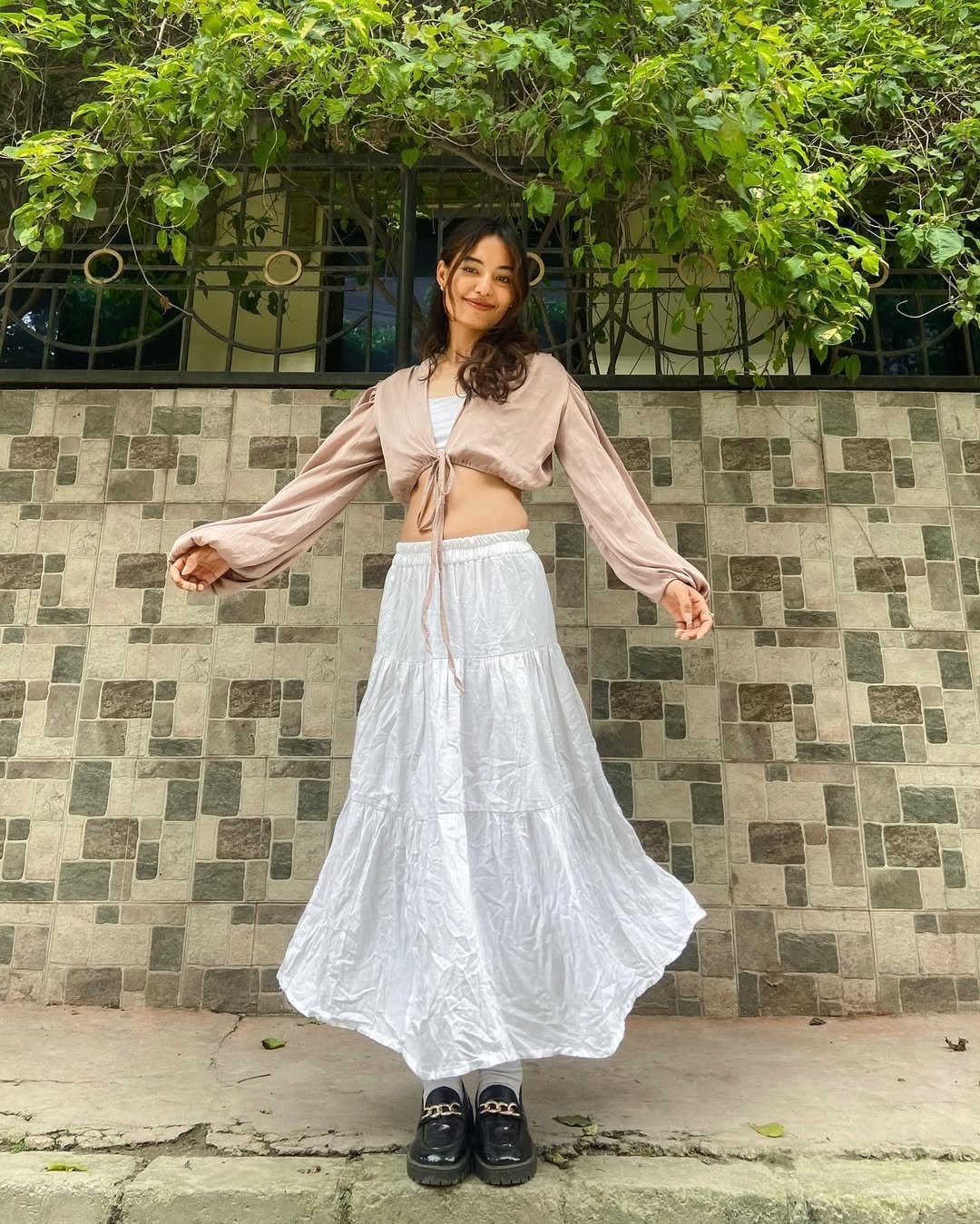 There’s a carefree charm to this outfit that makes it instantly likable. A flowing white tiered skirt paired with a soft tie-front blouse gives the look that relaxed, breezy shape that feels perfect for warm afternoons.