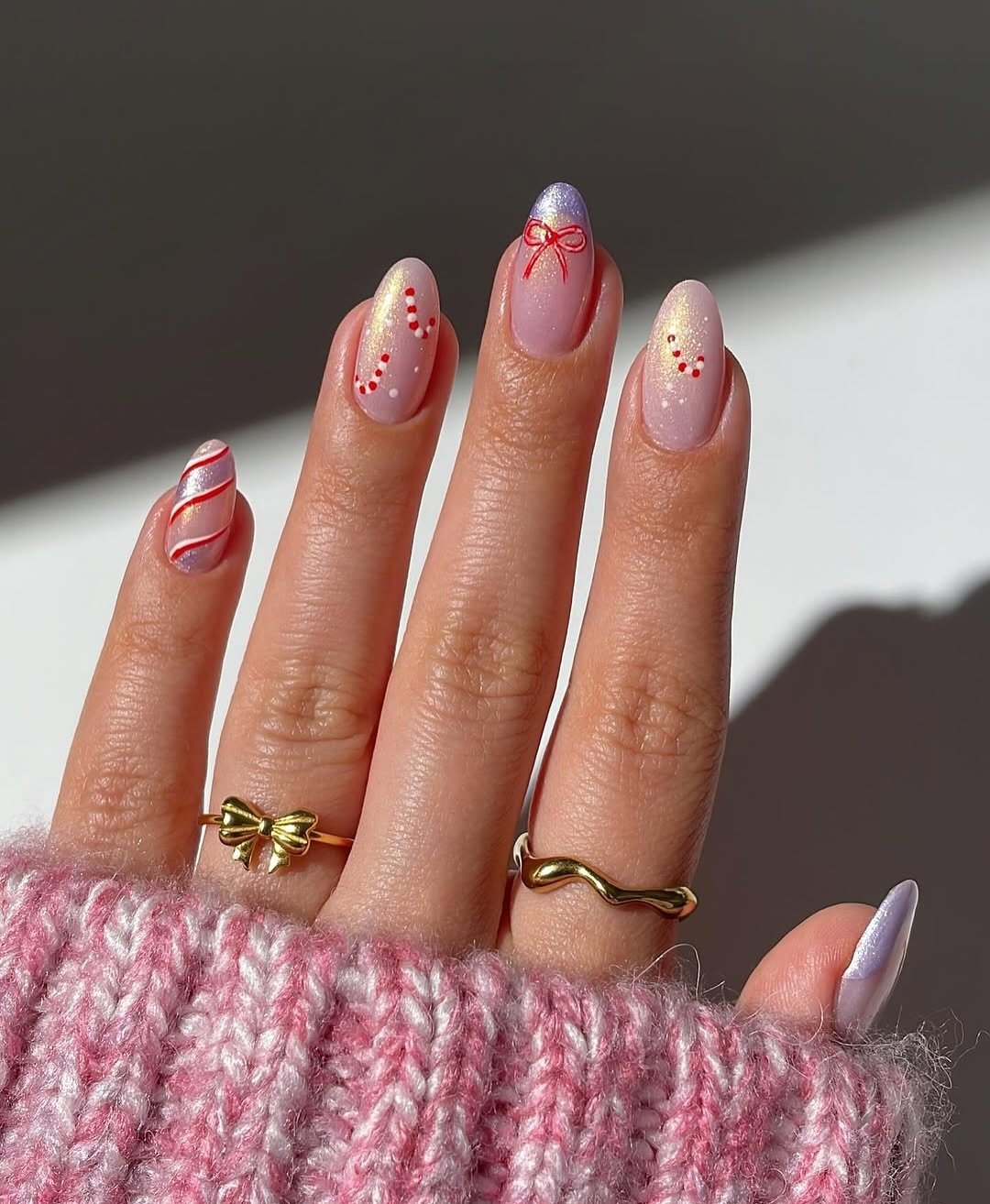 A pearly pink shimmer base with delicate red dotted swirls and the cutest little bow accent. It’s subtle sparkle with a touch of coquette charm.