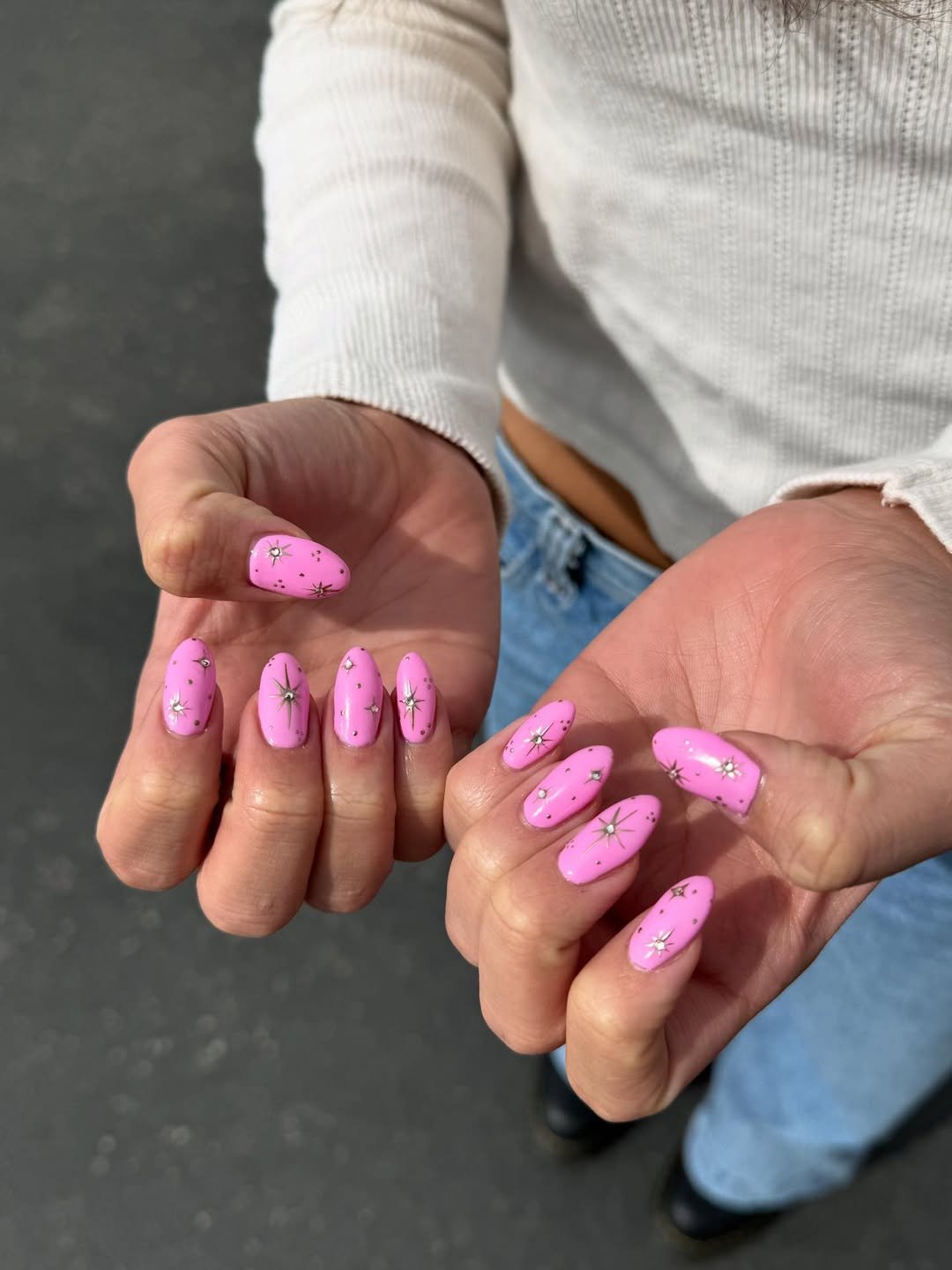 Hot pink, but make it celestial. The glossy bubblegum base paired with tiny metallic starbursts gives major “main character walking in the sun” energy.