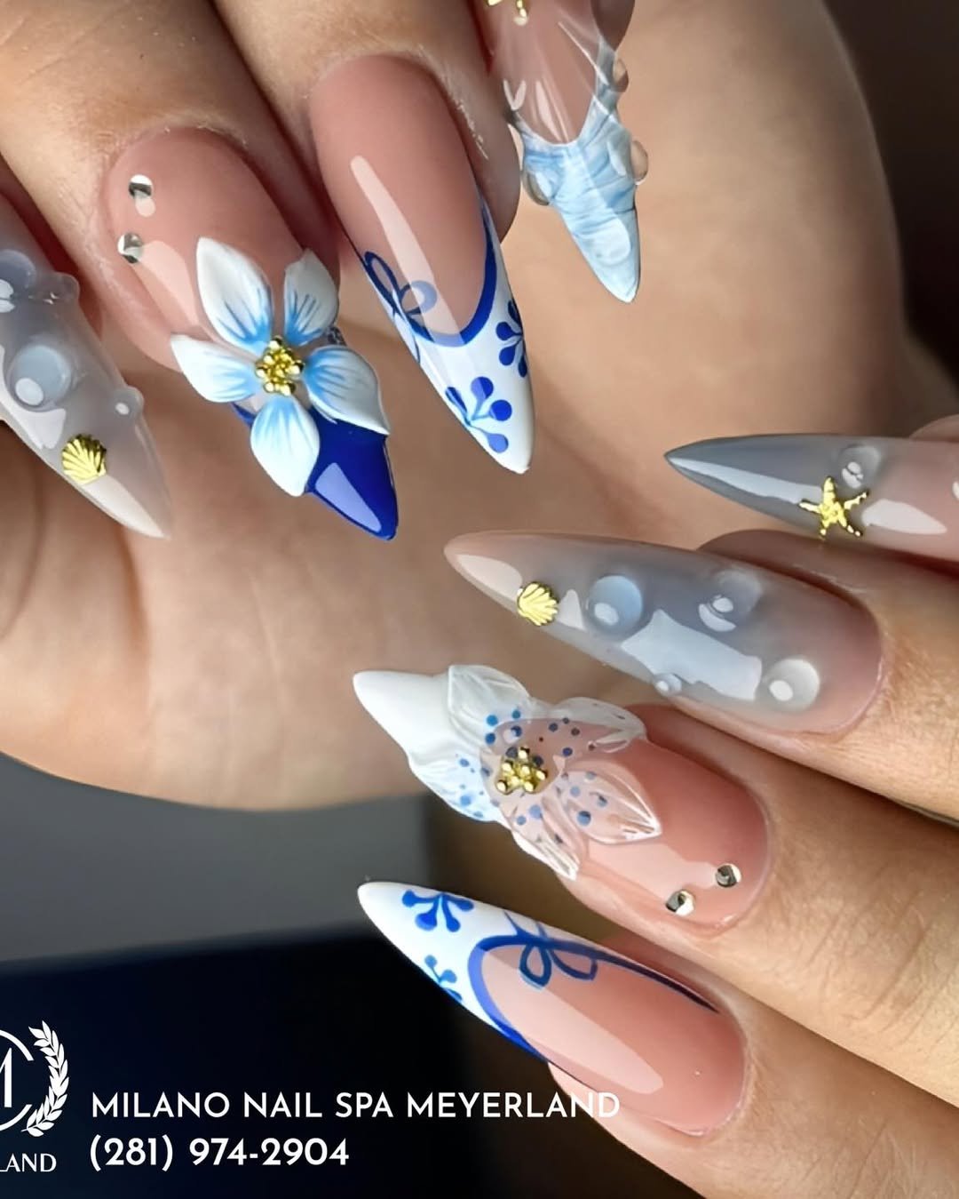 There’s movement in every nail, from the curved lines to the dimensional petals. It’s seaside elegance—but styled for a runway.