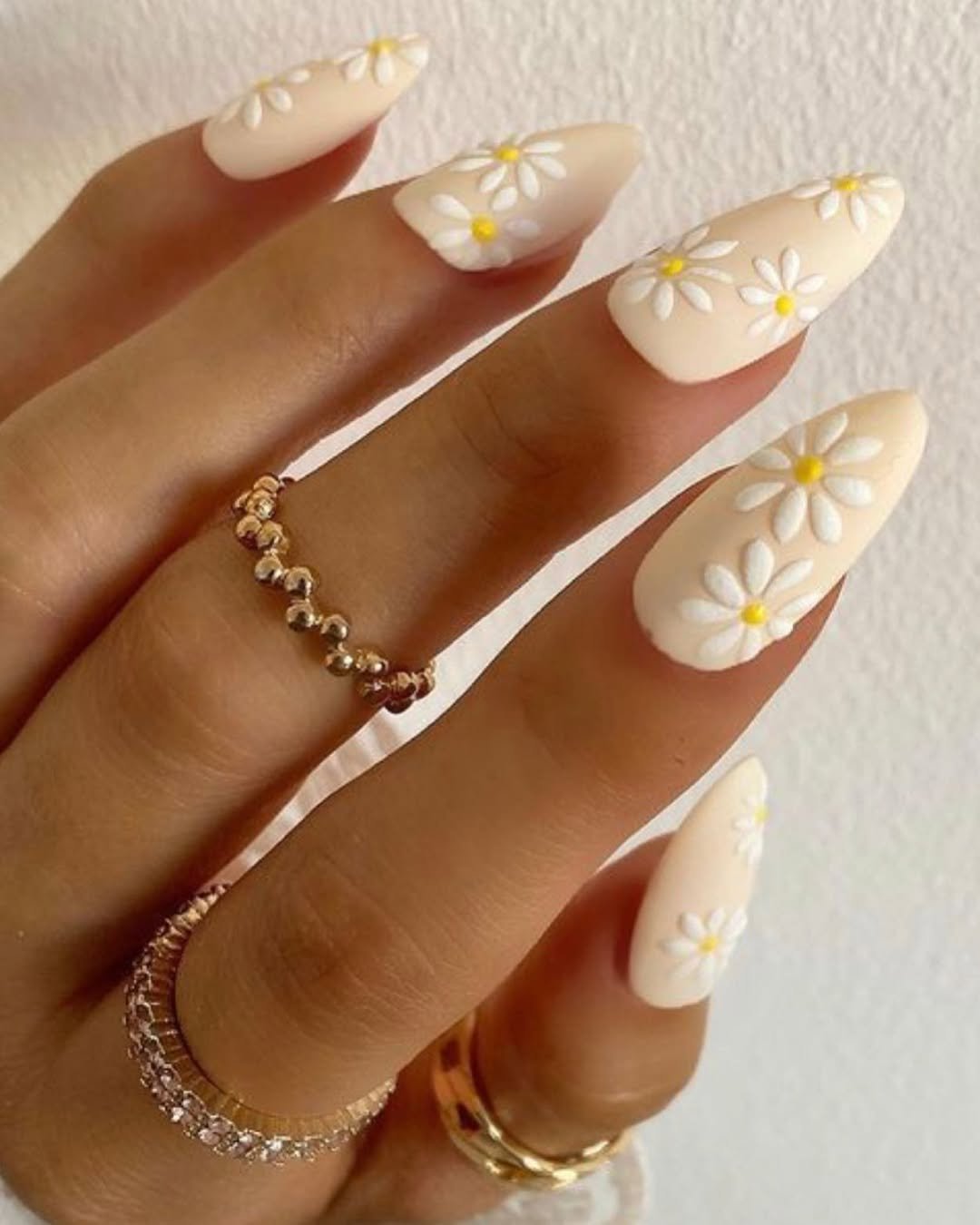 Matte ivory paired with raised white daisies and sunny yellow centers? It’s soft, clean, and just a little romantic. The texture adds depth without overwhelming the look.