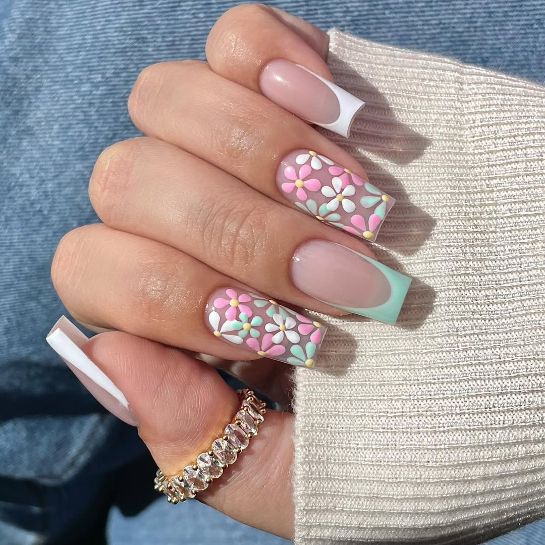 Soft pastel French tips in mint, pink, yellow, and blue, each topped with tiny white daisies. The nude base keeps everything airy and light, letting the colors pop without overwhelming.