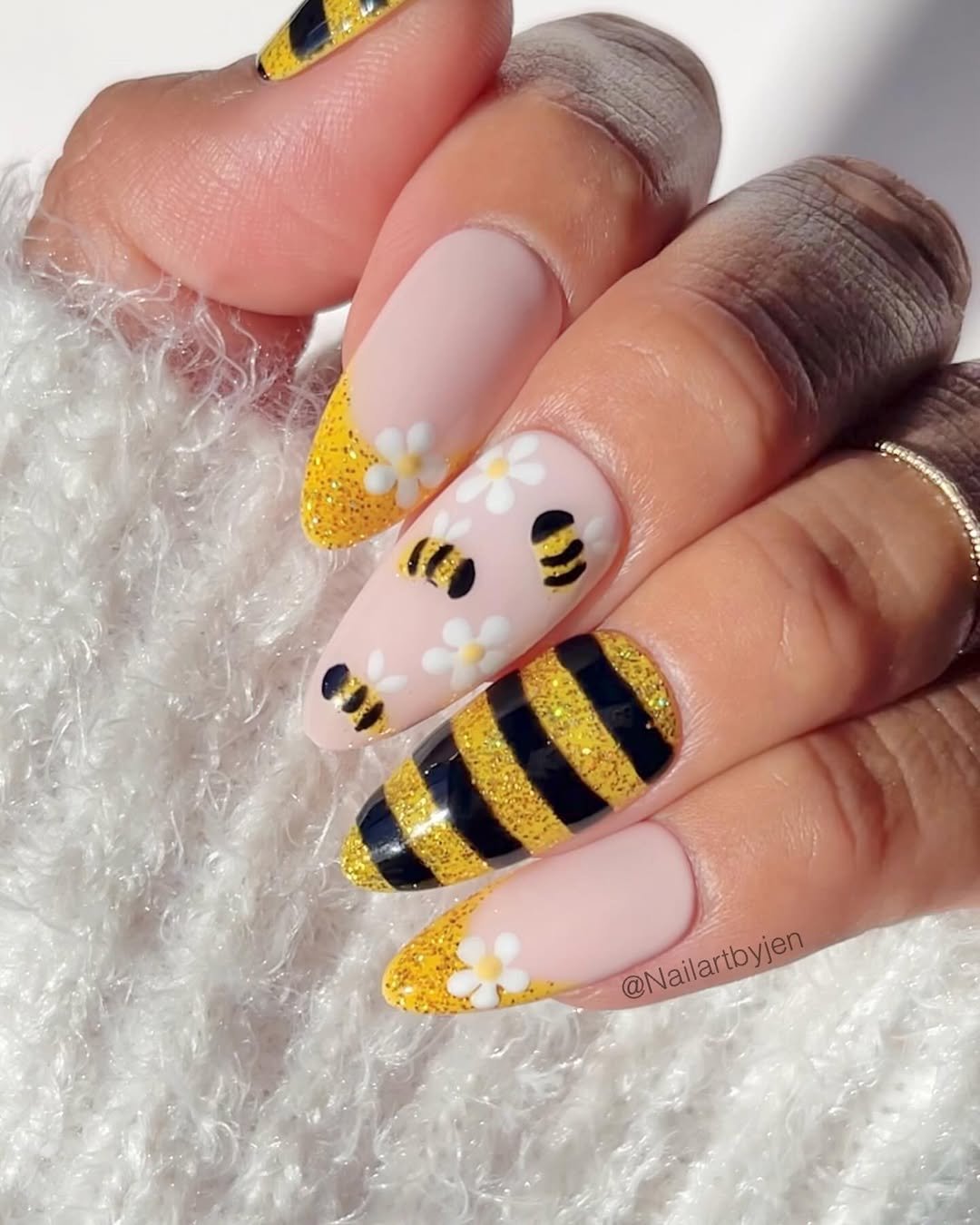 Okay but this is how you do themed nails without it feeling costume-y. The soft nude base keeps things chic, while those glittery yellow French tips and bold black stripes bring the buzz. And the tiny bees with daisies? Adorable, but still polished.
