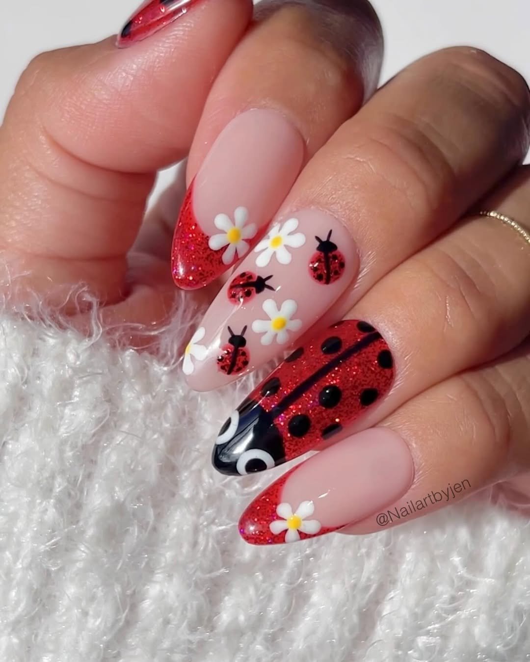 Glittering red meets soft blush, sprinkled with daisies and the cutest little ladybugs. The accent nail with bold black spots brings a playful contrast that makes everything pop.