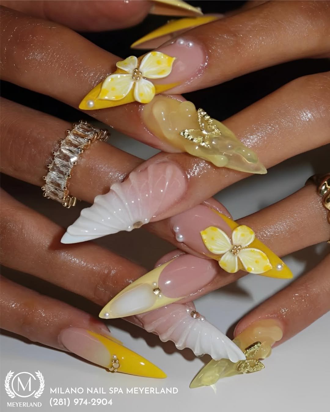 Bold yellow French tips paired with 3D florals and sculpted shell details? This is drama in the best way. The mix of textures—pearls, raised petals, glossy curves—creates serious dimension.