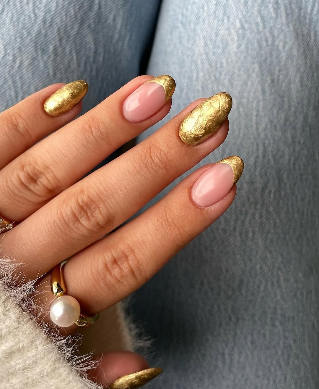 Classic nude meets molten gold, and suddenly French tips feel royal. The textured metallic finish adds depth, almost like brushed gold foil wrapped around each tip.