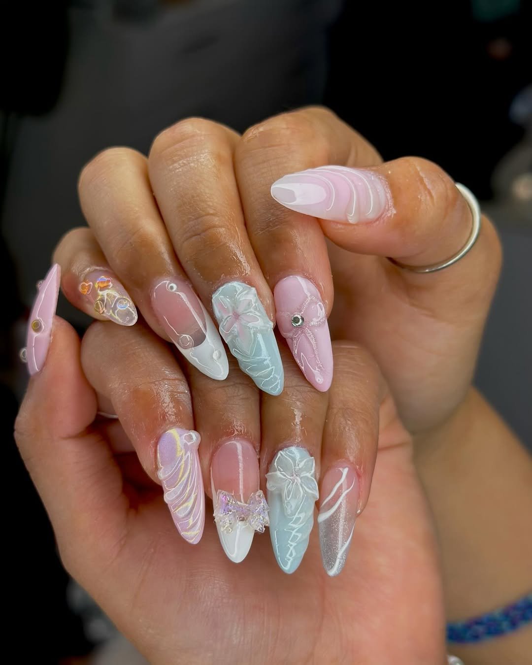 This is full-on nail art couture. 3D florals, bows, glossy swirls, dreamy pastel pinks and blues—it’s texture heaven. Every nail is its own tiny sculpture.