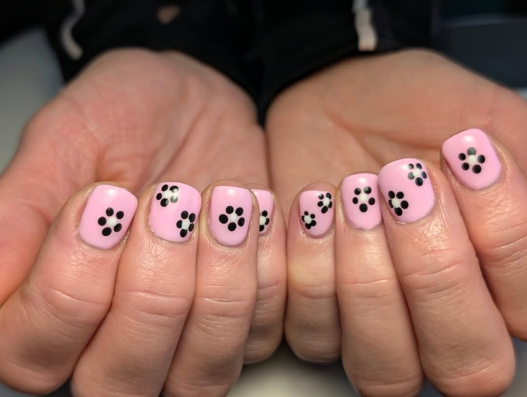 Soft pink base with tiny black dot florals—minimal, but undeniably cute. The short length makes it extra wearable and effortlessly sweet.