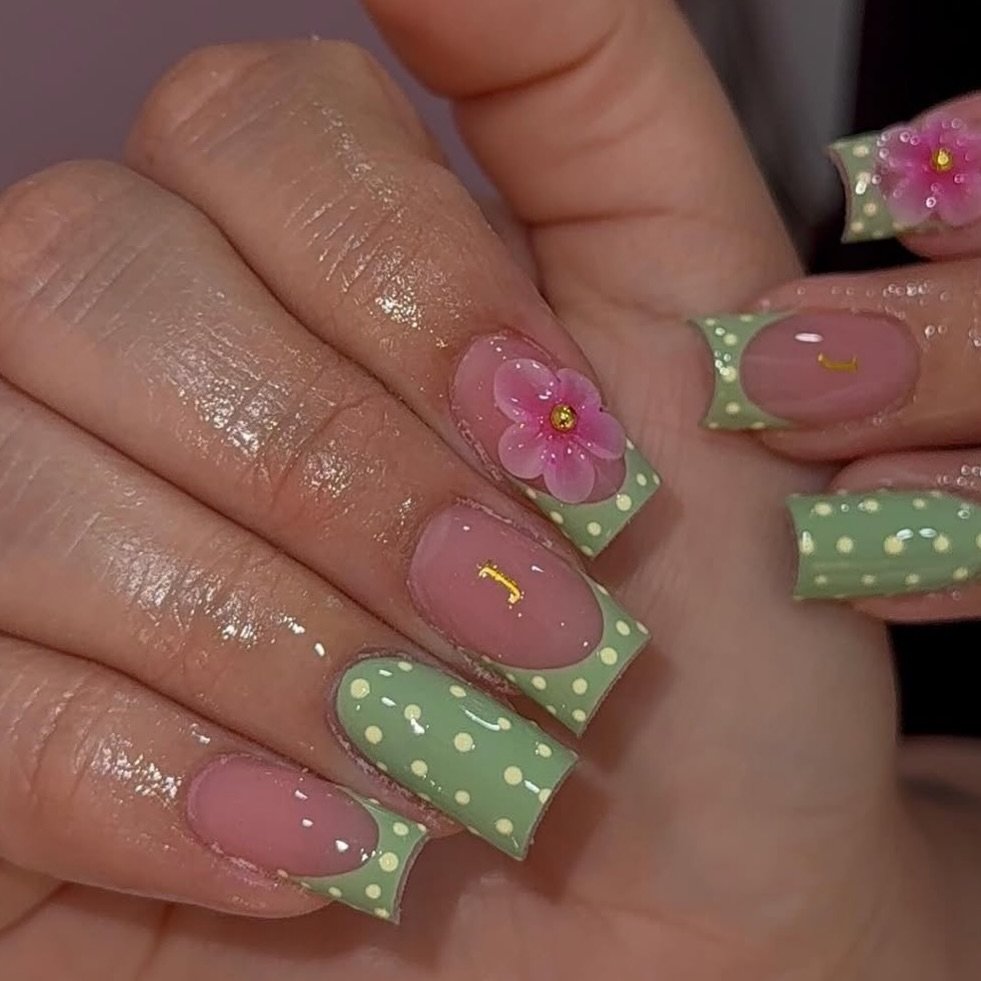 Sage green French tips with tiny white polka dots? Yes, please. Add in a glossy blush base and that 3D pink flower moment, and suddenly it’s giving picnic-in-the-park energy. The little gold accents are subtle but elevate the whole look from “cute” to curated.