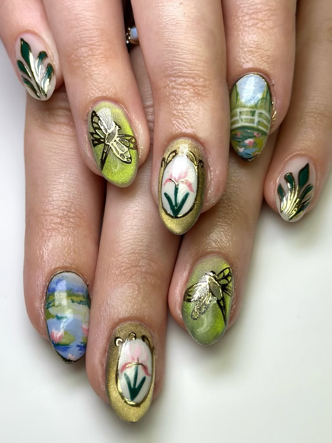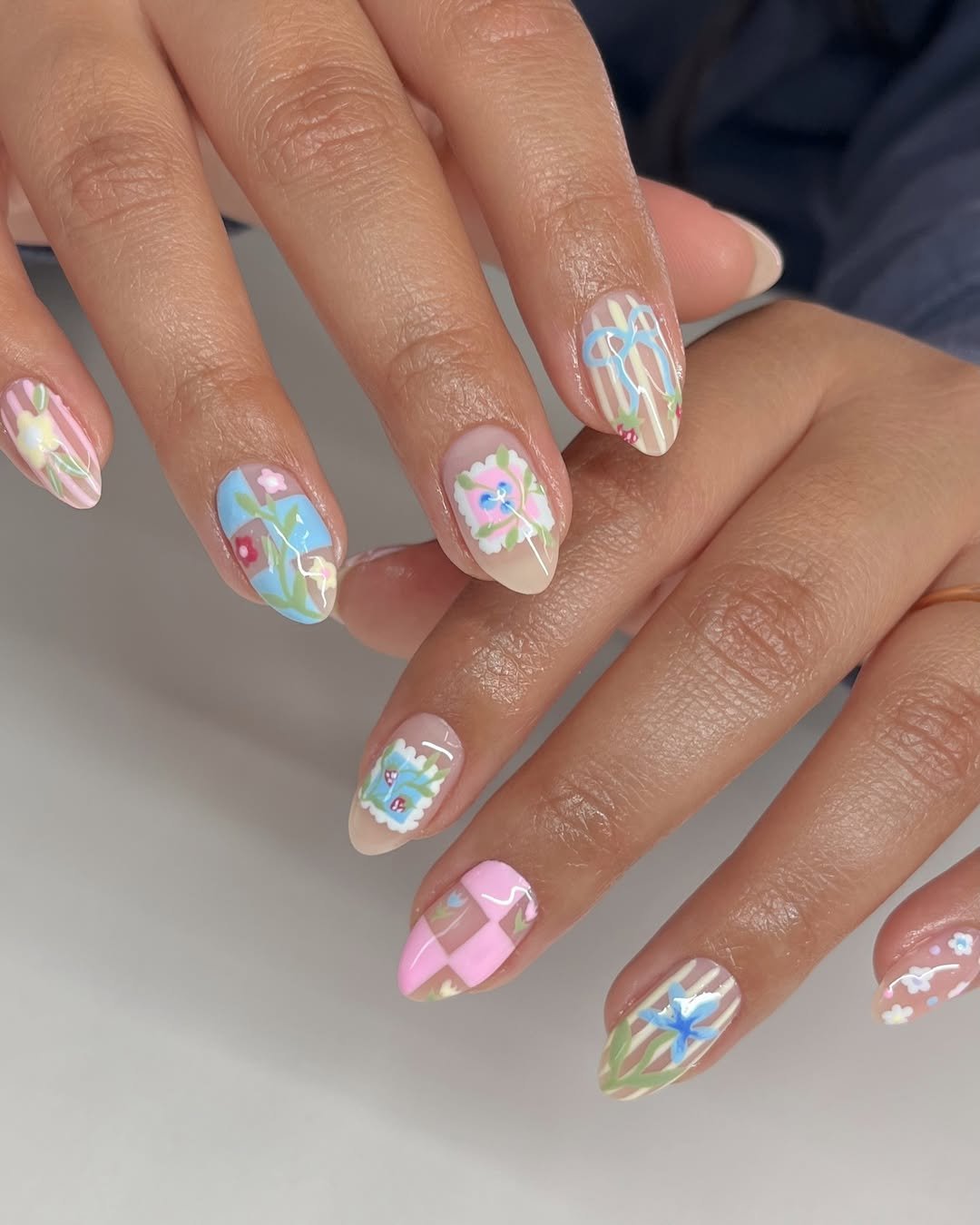 Each nail tells a different tale—florals, stripes, bows, soft pastels layered like a tiny illustrated meadow. It’s detailed but still cohesive, like a perfectly curated scrapbook.
