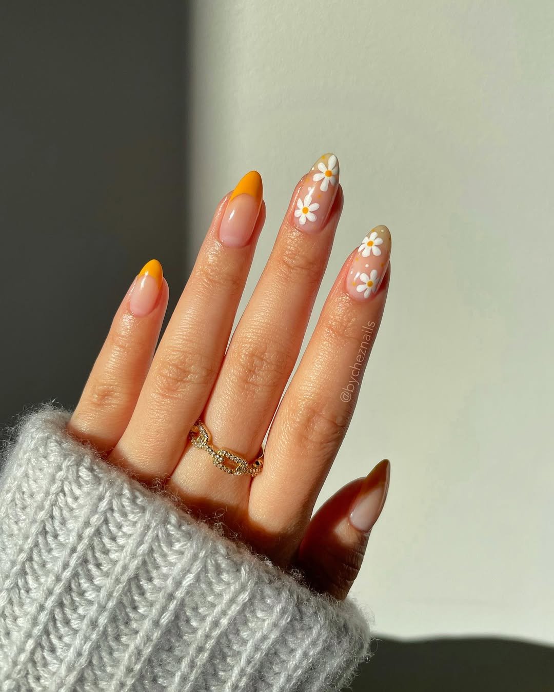 A bold yellow French paired with a sheer base covered in white daisies? Instant serotonin. The contrast between the solid tip and floral accent keeps it fun but polished.