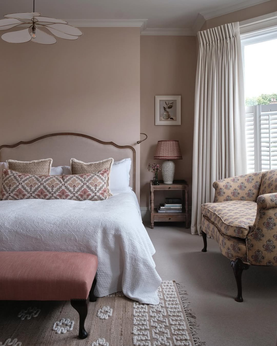 There’s a quiet charm in the details, the tailored curtains, the petite bedside table, the floral armchair tucked just right. It’s the kind of bedroom that invites slow mornings, where everything feels considered but never overdone.