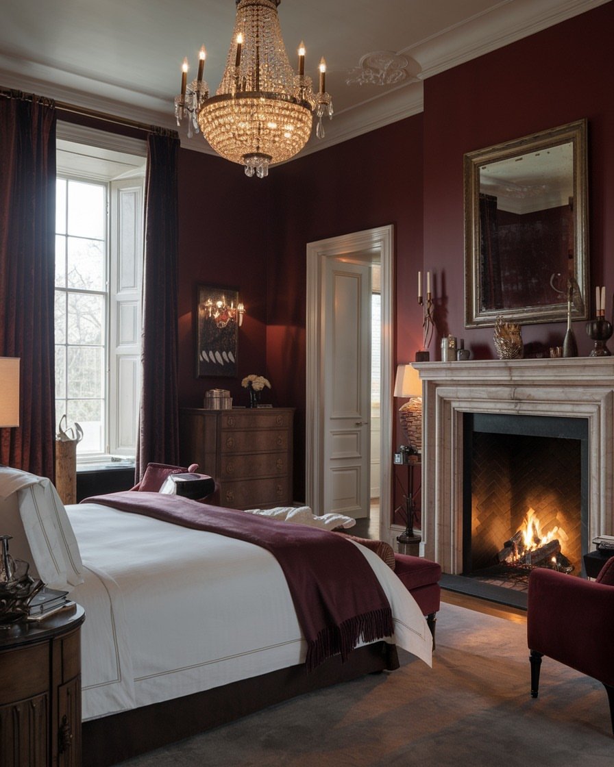 There’s a richness here that instantly draws you in. Deep burgundy walls wrap the room in warmth, while that glowing fireplace and crystal chandelier add a sense of old-world drama.