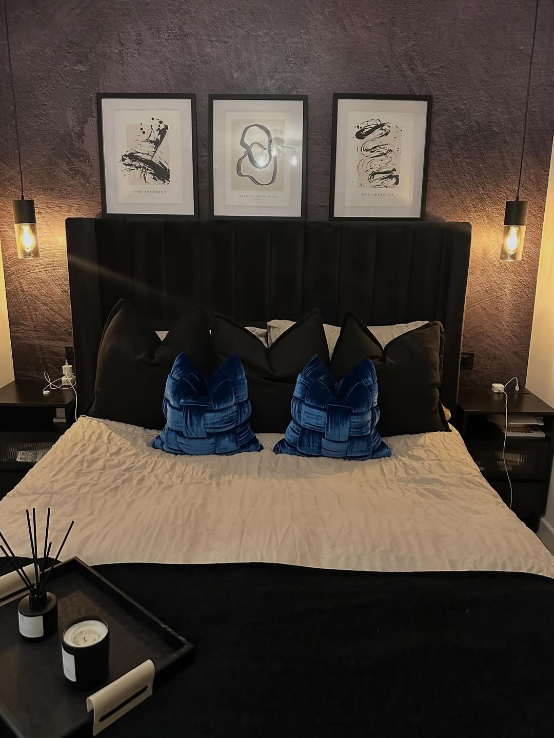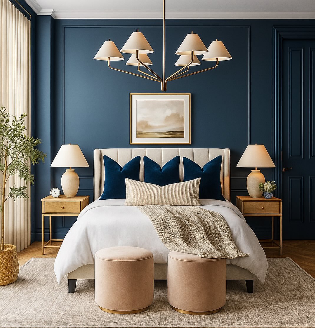 A deep blue backdrop instantly shifts the tone here. Clean lines and minimal decor keep the space feeling calm, while soft textiles add just enough warmth.