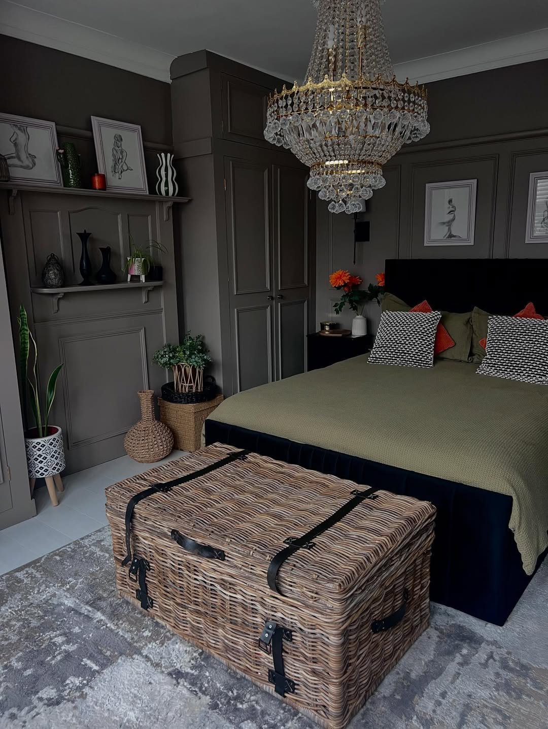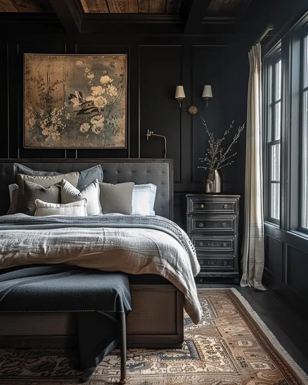 It’s simple, but not cold. A single piece of art, a few plants, and layered bedding create a quiet rhythm. If you love dark tones but want something more modern, this is the direction to take.