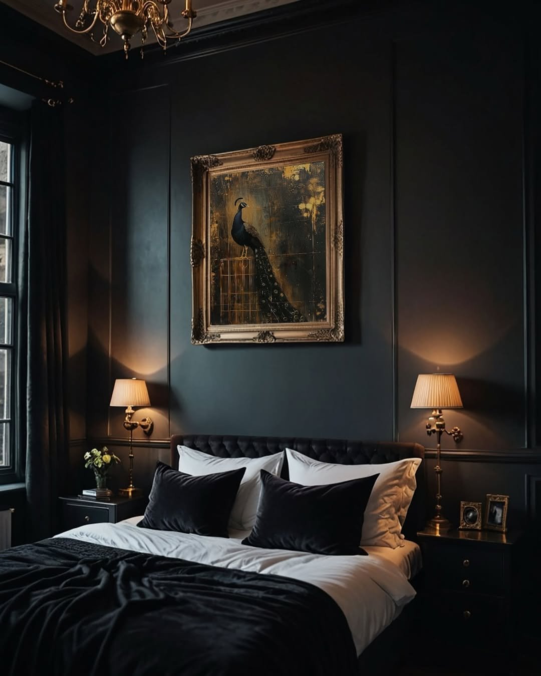 There’s a moody romance here that feels almost cinematic. Deep walls, warm lamplight, and that ornate framed artwork create a space that feels both intimate and dramatic.
