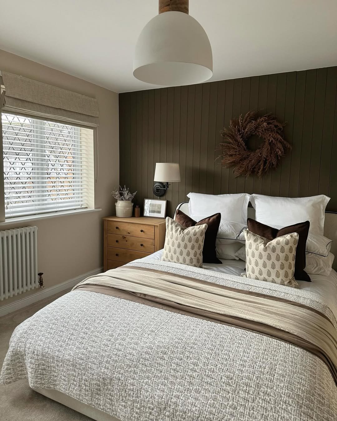 Paired with simple bedding and a few organic accents, it never feels heavy. It’s a reminder that darker tones can feel comforting when you keep the styling minimal and let the texture of the walls do the work.
