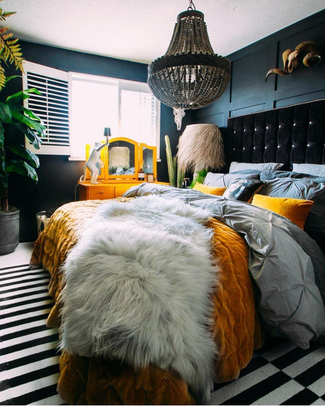 This room leans into personality. Black walls, layered textures, and pops of mustard create a space that feels curated and expressive. It’s a little edgy, a little glam.