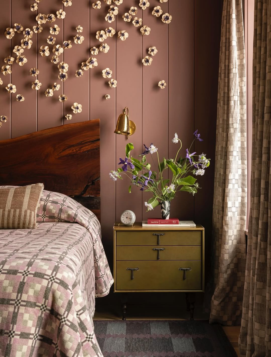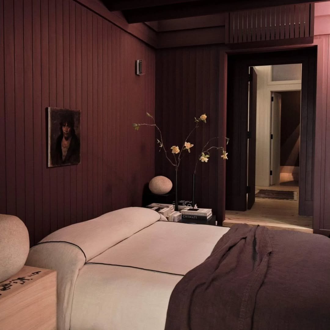 There’s something deeply cocooning about this room. Plum-toned wood paneling wraps the space, creating a moody, almost cabin-like atmosphere that feels intimate and grounded.