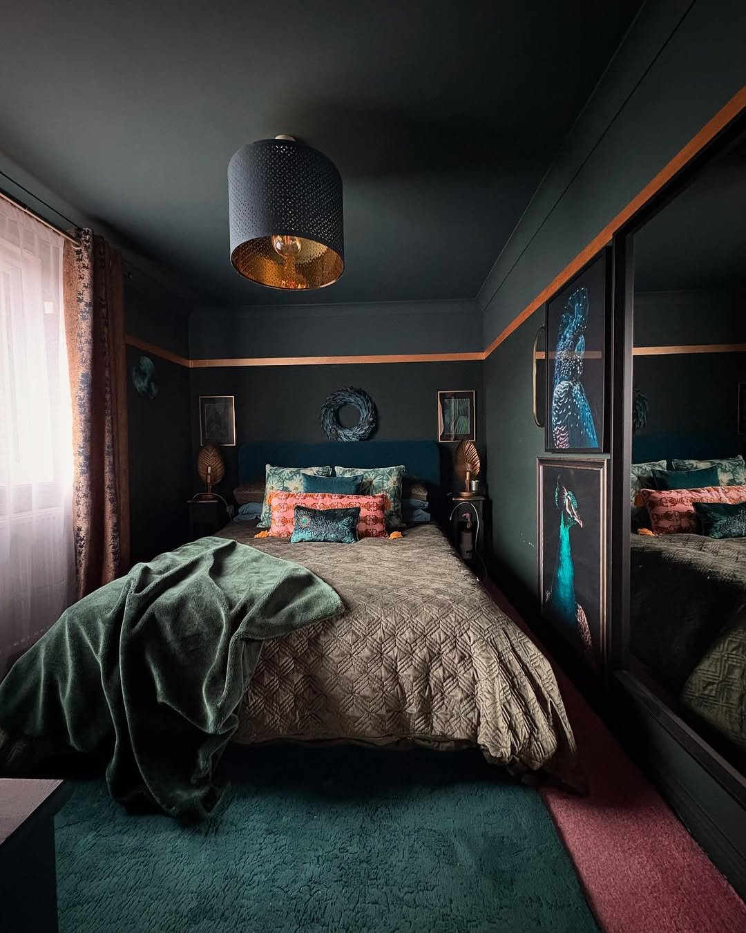 There’s a richness here that feels almost cinematic. Saturated teal walls, layered textiles, and those bold peacock prints create a space that feels intimate and a little mysterious.
