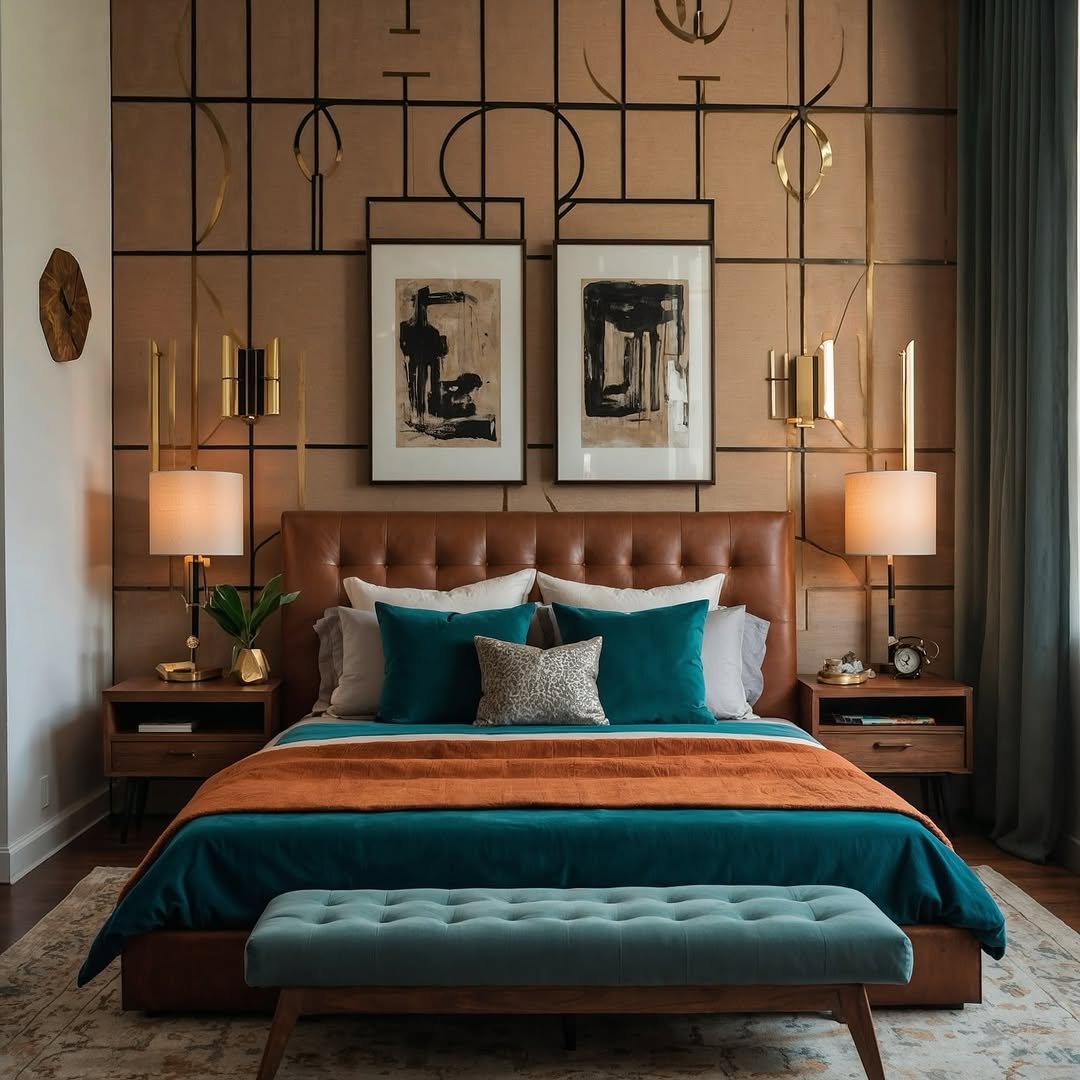 There’s a refined edge to this space that feels almost architectural. The geometric wall design, warm wood tones, and deep teal accents create a layered, elevated look.