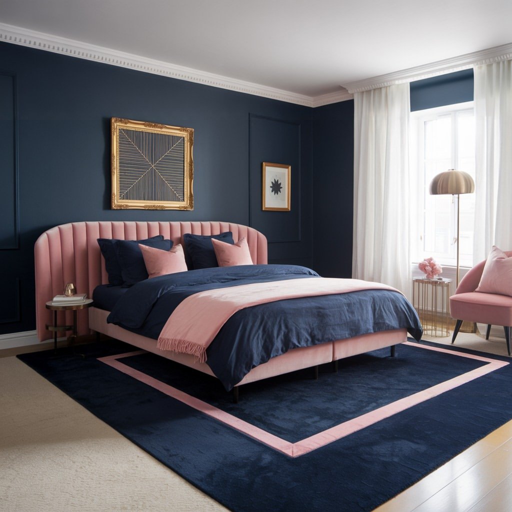 There’s something so striking about navy and blush together. The deep walls ground the room, while the soft pink bed adds a gentle, almost romantic contrast. It feels modern, but still soft enough to unwind in.