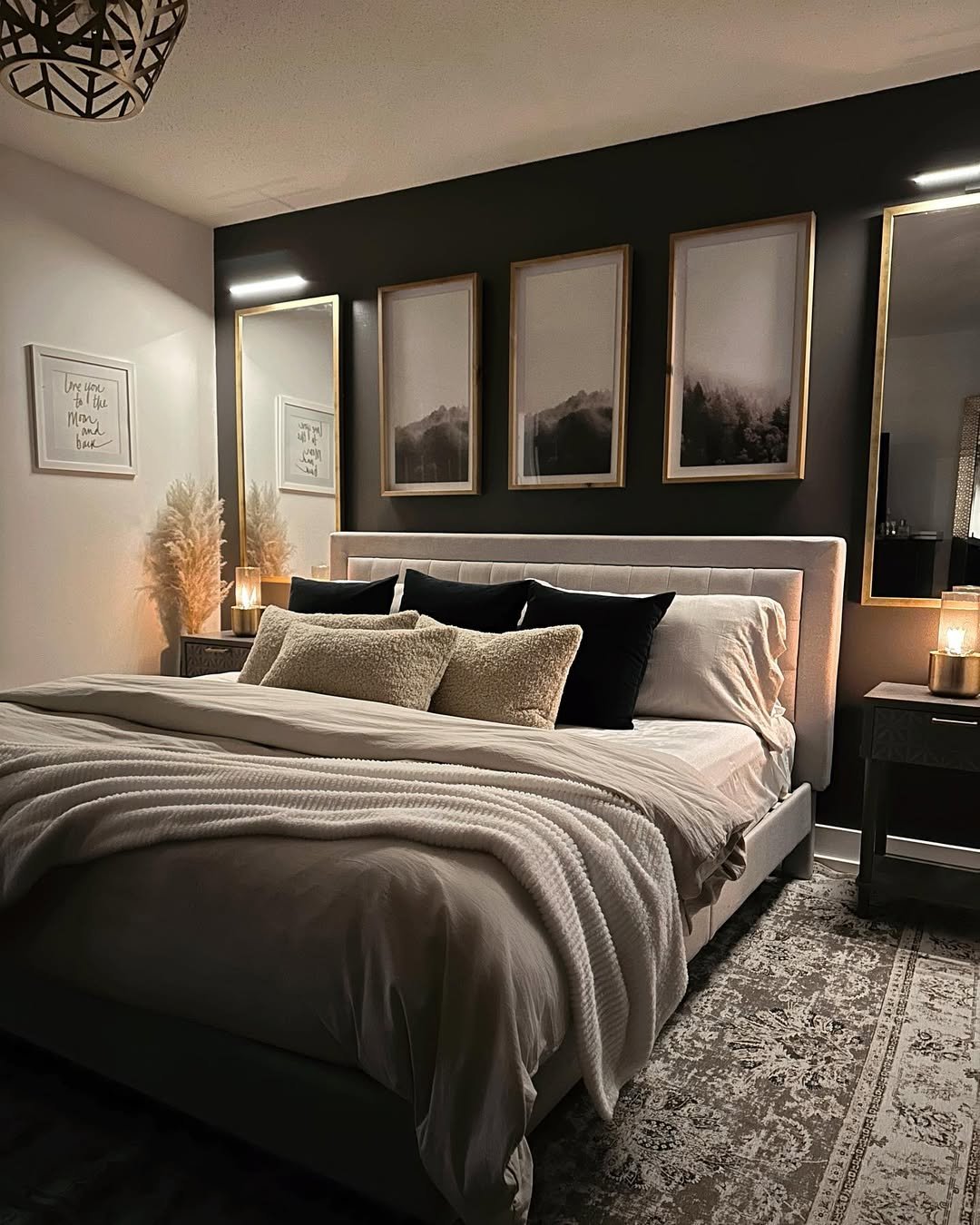 There’s a softness here that feels instantly calming. A dark accent wall frames the bed, while neutral bedding and warm lighting create a gentle contrast.