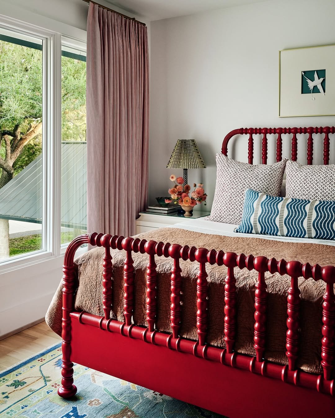 Not all dark feminine spaces have to be serious. This one mixes a bold red bed frame with soft drapery and patterned textiles, creating something that feels playful yet grounded.