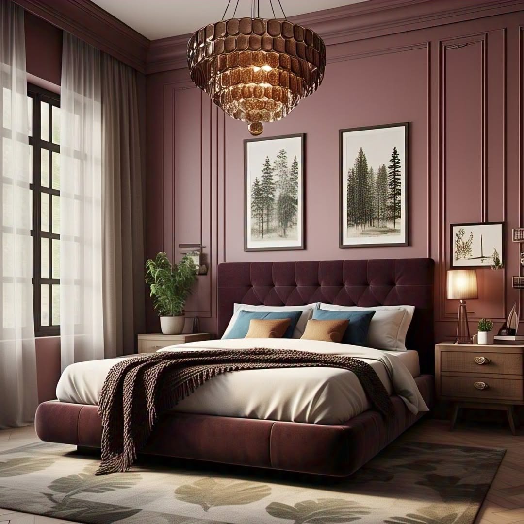 Panelled walls and a statement chandelier give this space a tailored edge. The palette leans warm, with deep rose tones and soft neutrals woven throughout.