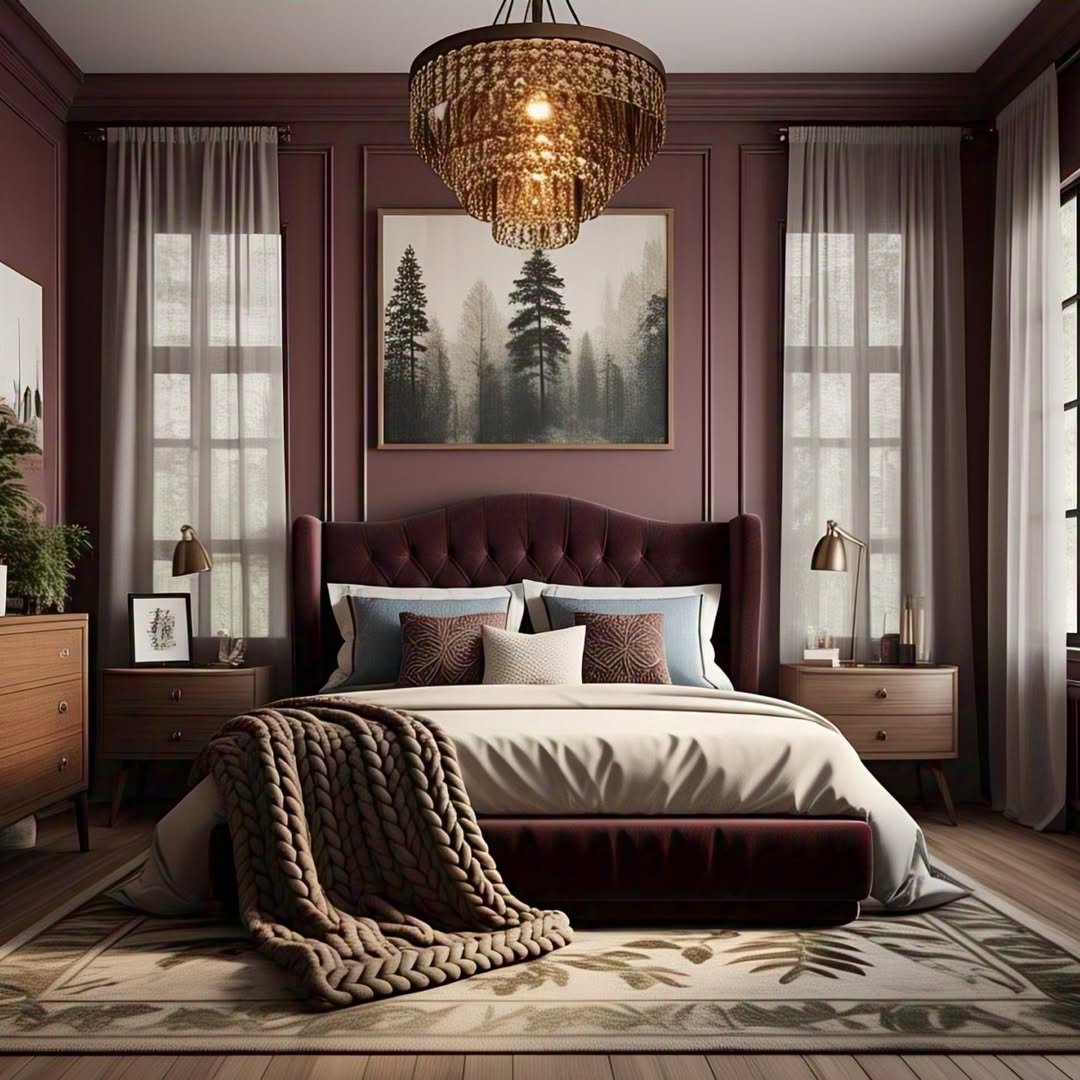 There’s something grounding about this space. Rust-toned walls, a patterned ceiling, and layered bedding create a room that feels rich but deeply comforting.