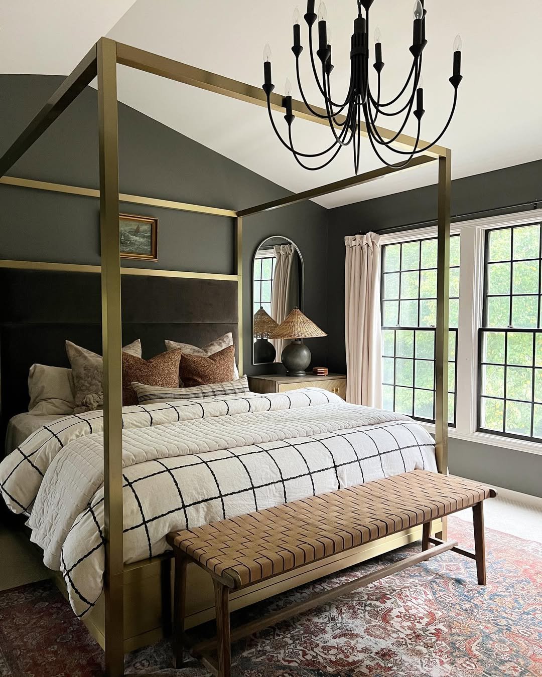 A canopy bed always brings a sense of presence, and this one does it with quiet confidence. The clean frame adds structure against those darker walls, while the neutral bedding keeps everything grounded.