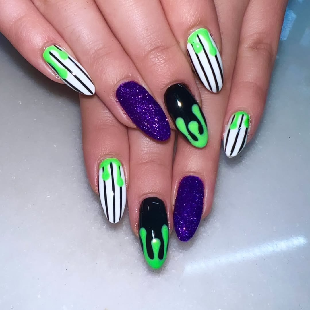 If Halloween had an electric pulse, this would be it. Neon slime green drips across bold black-and-white stripes, with punchy purple glitter tossed in for texture. @beautybyhillsxx leans all the way into campy fun here, and it totally works.