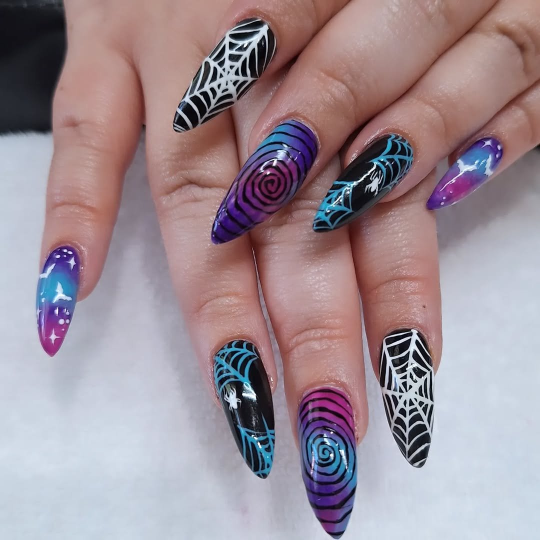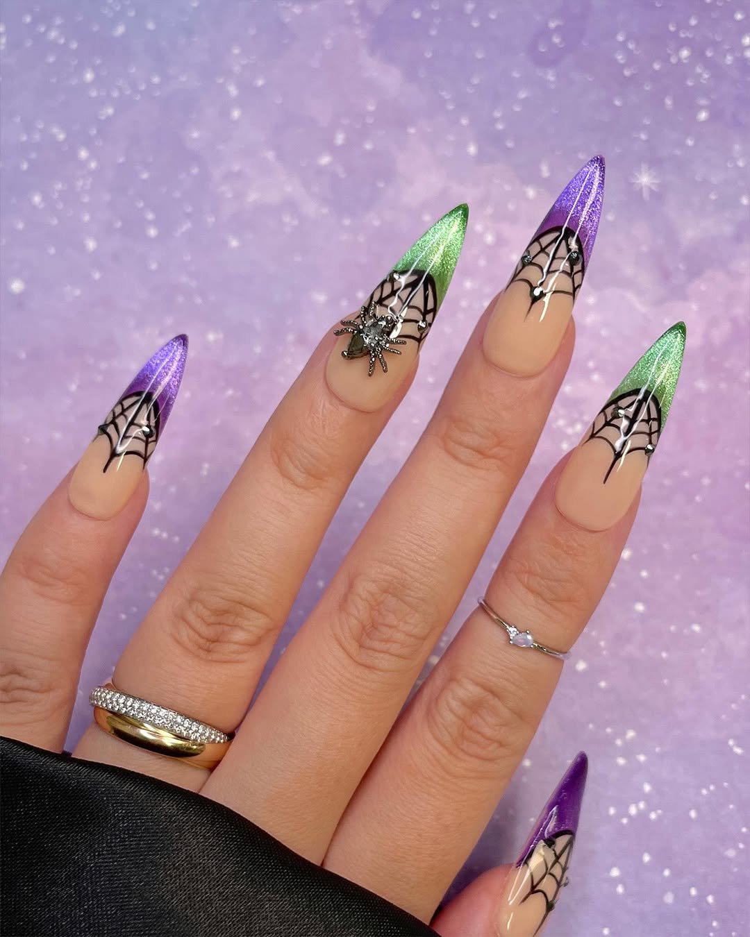Purple and green may sound like a lot, but @daily_charme makes it ethereal. These stiletto tips shimmer like fairy wings under moonlight, while the webbed overlay and bejeweled spider add just enough spook without tipping into costume territory.