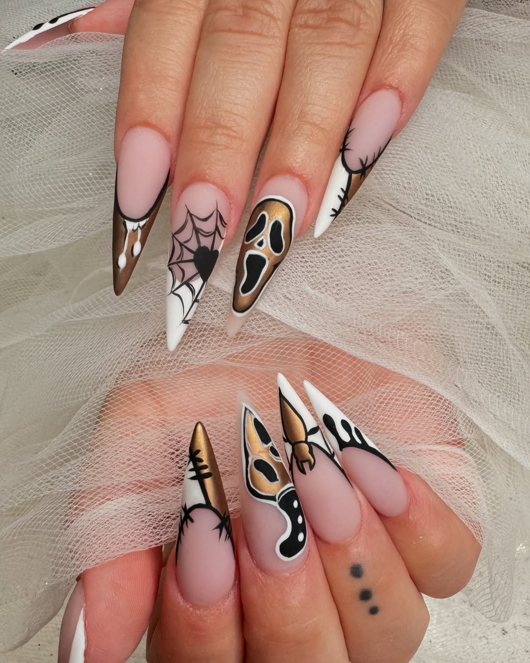 This is Halloween with a glam upgrade. @oscarnailsplano delivers a spiky stiletto set packed with personality—think gold-foiled “Scream” faces, dripping webs, and stitched-up French tips. It’s edgy, theatrical, and just the right amount of eerie.