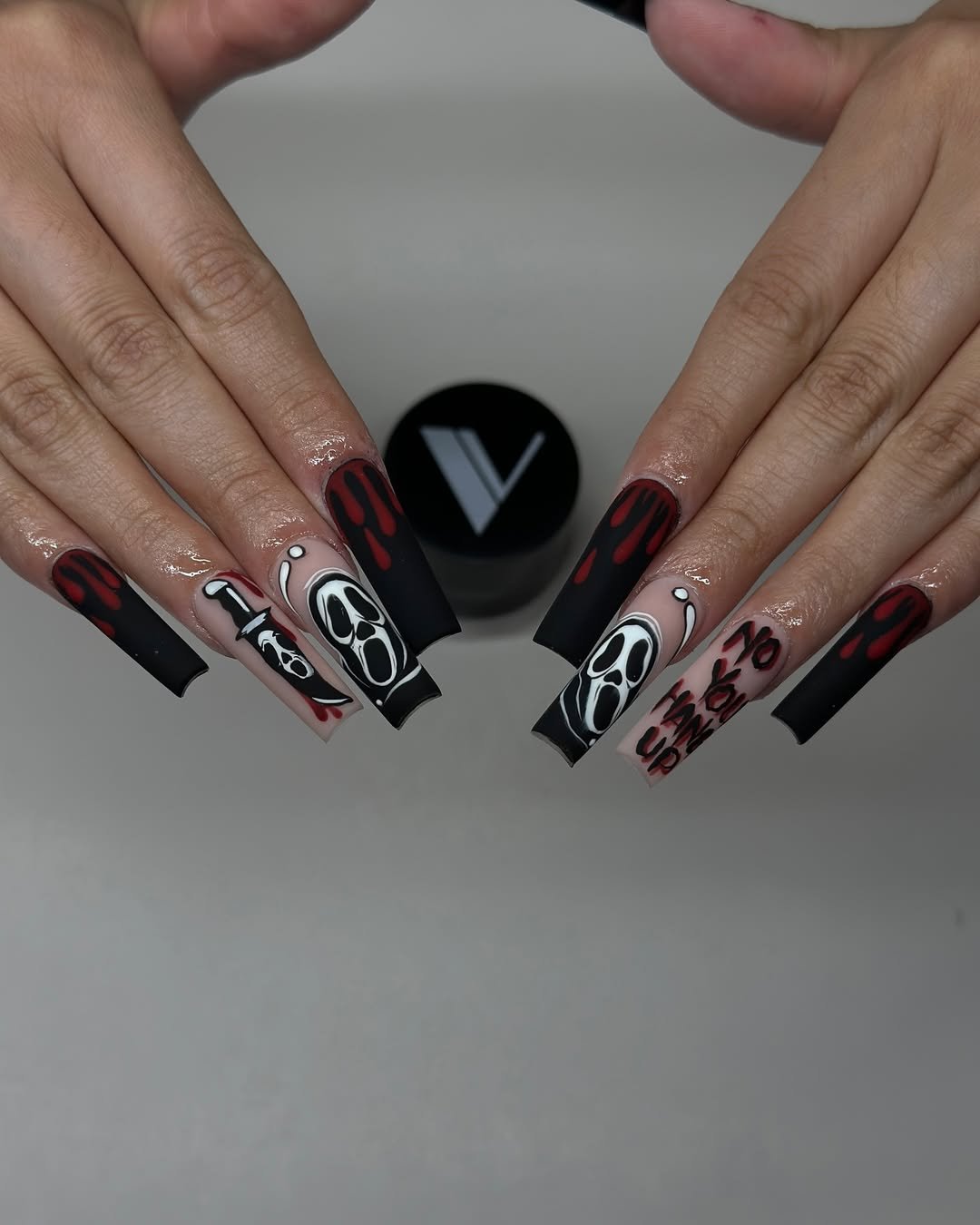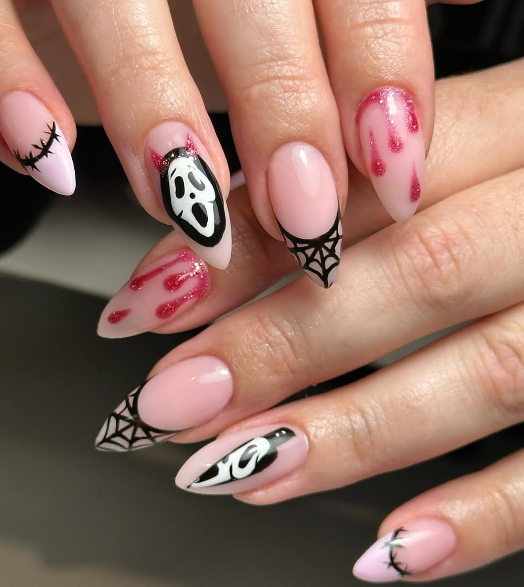 This horror-glam set from @mitty.nails brings the Scream queen energy. With dripping blood tips and a ghostface moment front and center, it’s the slasher flick mani we didn’t know we needed.