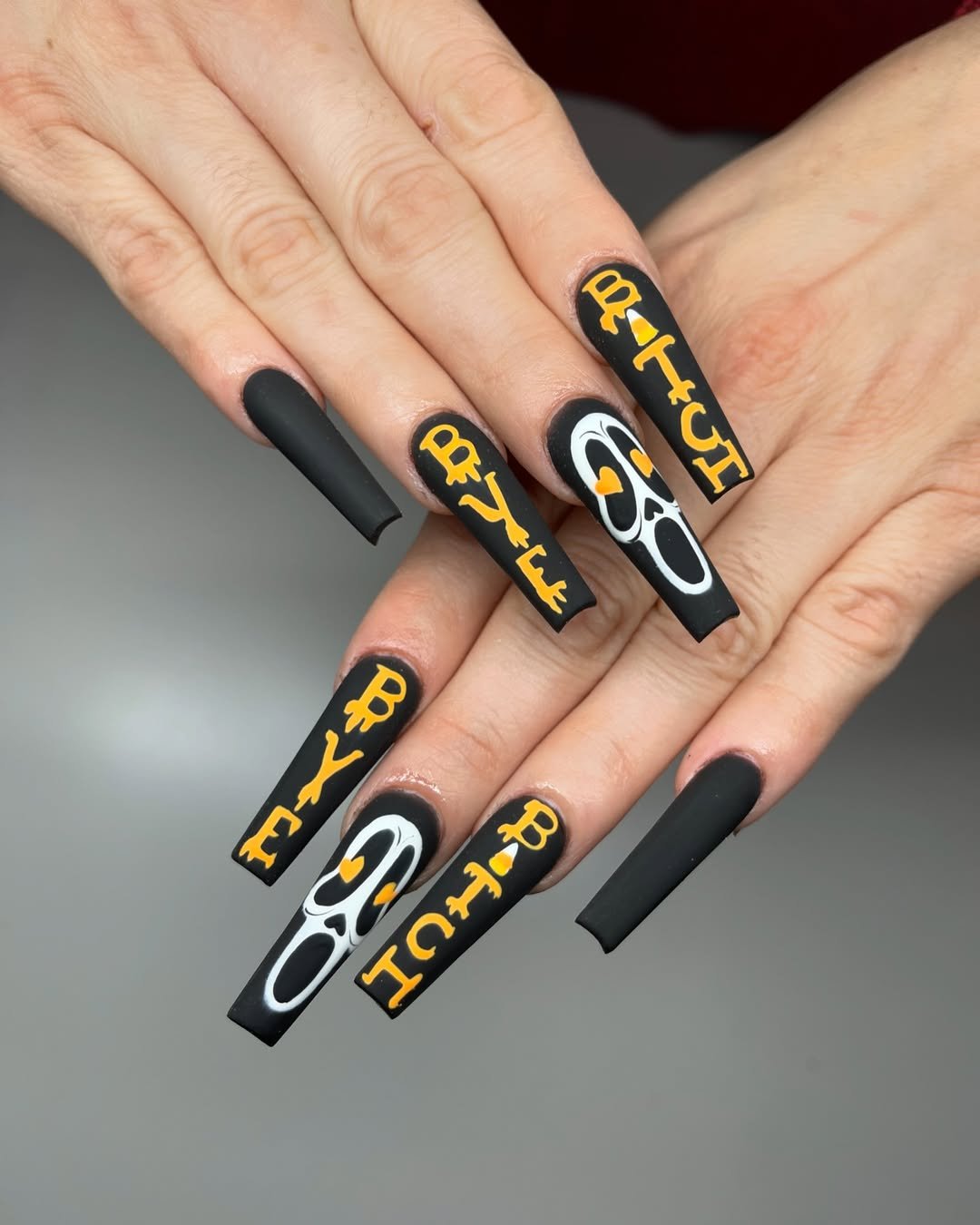 Matte black, screaming faces, and sassy phrases—this set is serving Halloween villain with a side of shade. The crisp yellow lettering (“BYE B*TCH”) layered over coffin-shaped nails adds just the right touch of bite. Bonus points for the orange heart eyes on Ghostface—iconic.