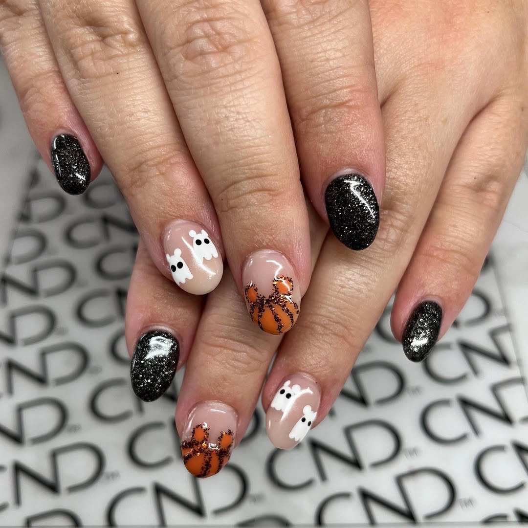 Each nail has a different act—spider webs, boo faces, and gothic skies—that come together in the chicest horror short film. The sparkle base softens the scares just enough to keep it luxe, not costume-y.