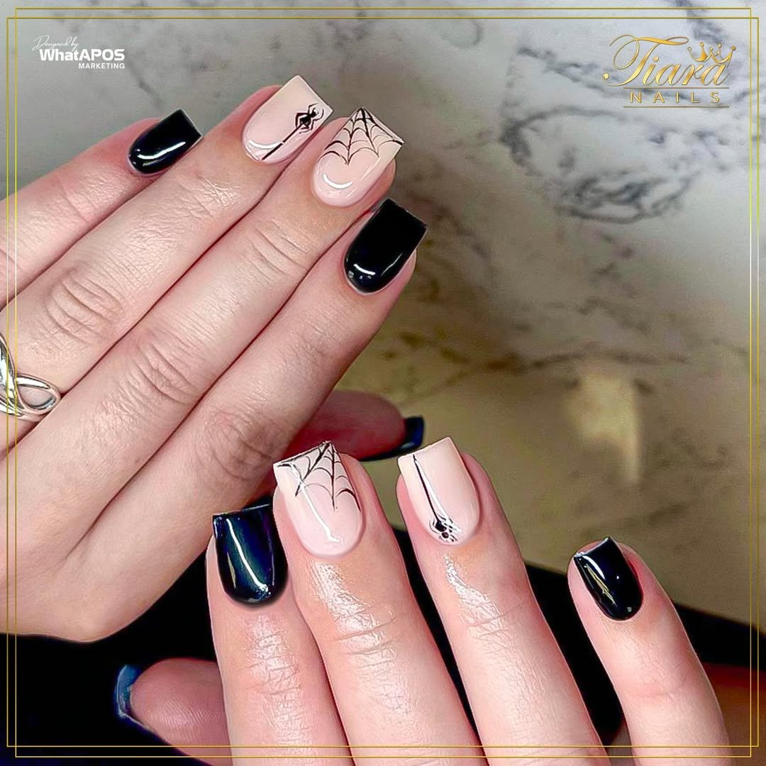 Less is more, and @tiaranails.az proves it. These short square nails pair shiny black polish with creamy neutrals and minimalist spiderwebs. The negative space? Intentional and sharp.