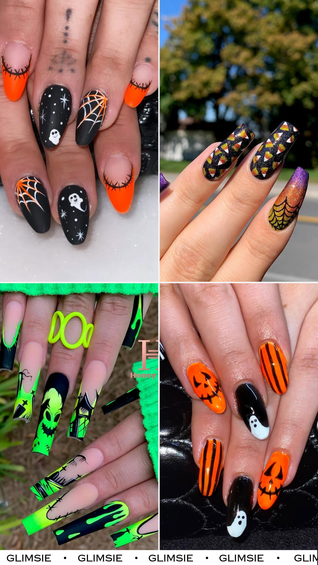 The striped accents balance out the bolder designs, and the mix of faces—smiling, spooky, and silly—give it major personality. These nails are made for dancing at Halloween parties and stealing extra Reese’s cups.