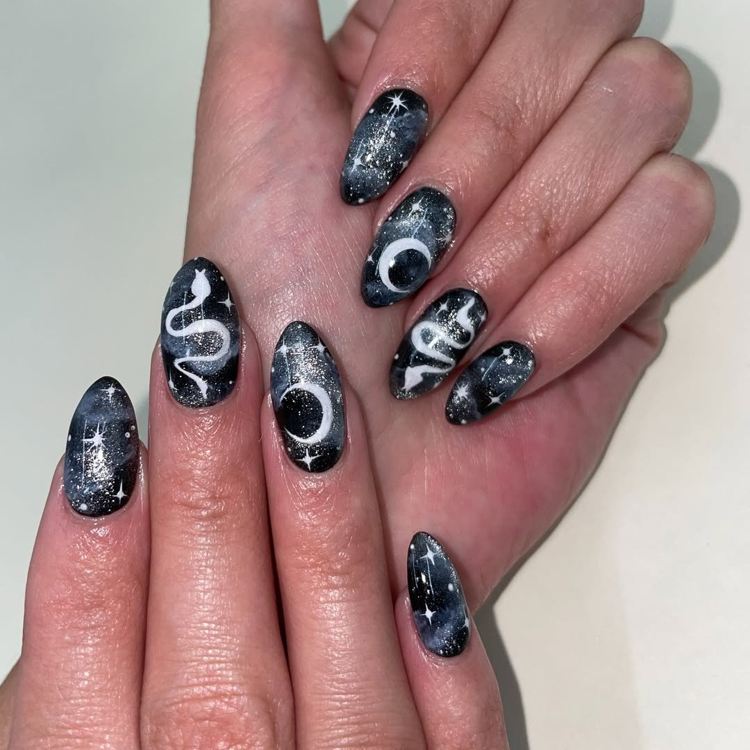 Dark galaxy nails, but spooky—@onyxaesthetics nailed this astral design. White snakes and crescent moons float over a black, silvery background that looks straight out of a starry night sky. It’s mystical, moody, and definitely a vibe.